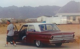 Flip's 1962 Ford Fairlane 500. Looking all gangster in hi Nike Cortez and Dickies. Notice the pony tail.